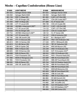 For me, this was p43 for Mercenary Company ‘Mechs in 3028-3050. I rolled up mechs available for purchase using the ratios of of 4:5:6 for light, medium, heavy/assault at the top of the table on p14 of Campaign Operations.