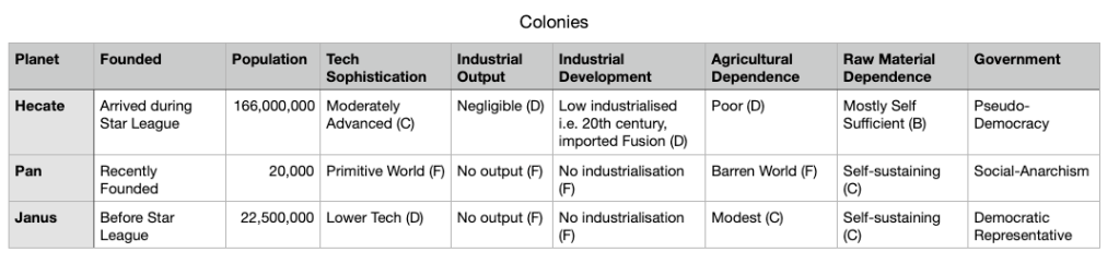 With a population of 22.5m and a democratic government, Janus has the potential to be a great force with a breathable atmosphere, abundant surface water – and though agriculturally self sufficient, with such a low population it has an extremely limited industrial base.