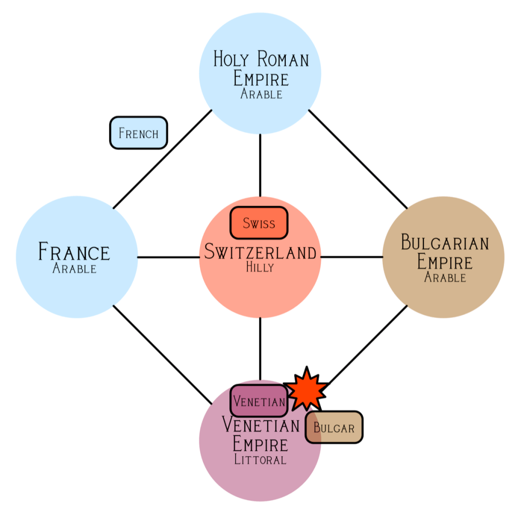 - Each army has a defined aggression rating of 1-3, each year roll 1d6 and add the aggression to determine the next battle. The highest total is attacker, and of the lands connected to them the lowest is the defender.