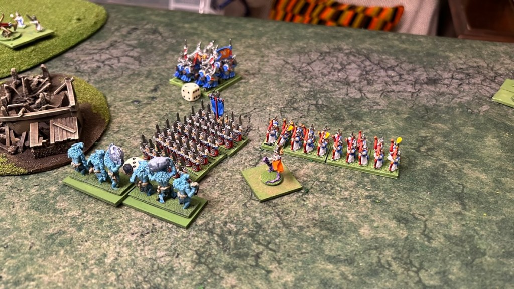 Eschewing their multiple attacks for an auto-hitting vomit attack, the Trolls cause 2 casualties against the Silver Helms and take none in return – since they cause Fear the Silver Helms auto-break and flee, and their rout causes the adjacent spearment to panic and rout too. The Trolls pursue, colliding with the fleeing spearmen and wiping them out.