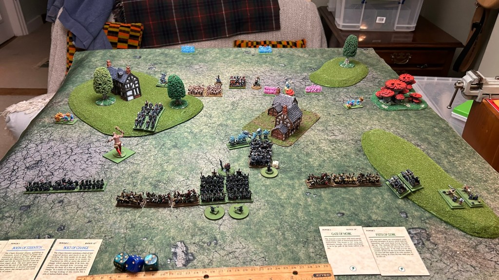 Unfortunately, this magical counterpunch is not sufficient to offset the carnage inflicted by the giant, who proceeds to break and run down the adjacent warriors and their sorcerer in turn four. With the loss of their armoured core, their lord and sorcerer, and the earlier loss of their human assets – the forces of Chaos concede.