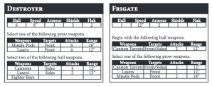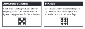 The Void Admiral fleets each have four ship types: large, medium, small and a trio of tiny ships. They are differentiated with slightly different statistics, and different loadouts of the three weapon types. The main difference between factions comes from their command board – at the start of the game a player rolls 6D6 and places the dice in the relevant areas of the command board, and can spend those dice for the related ability during the game: