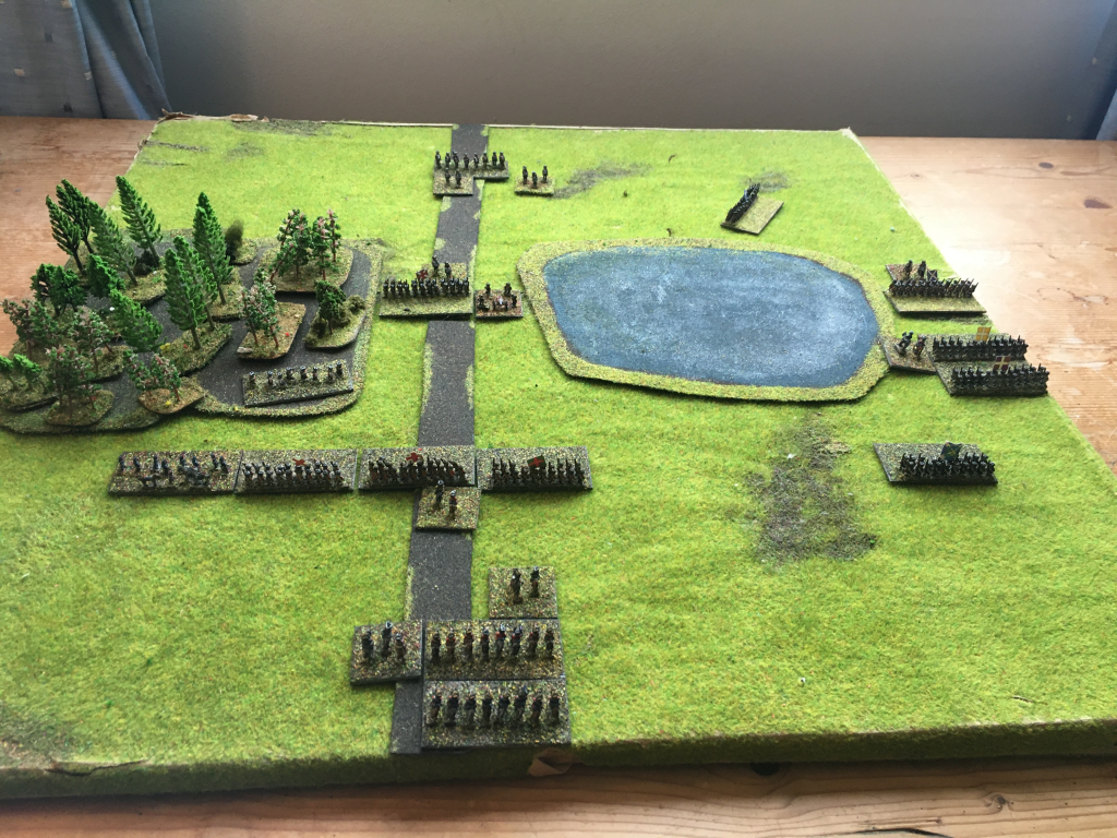 For my Napoleonics I used 2mm figures, each on a 1″x1″ base – so about half the frontage of the proposed PA 40mm units. I was able to play some fairly large battles on my 3×3 board, so on the assumption I can stretch to the use of a dining table instead of a fold-out card table, that should be sufficient.