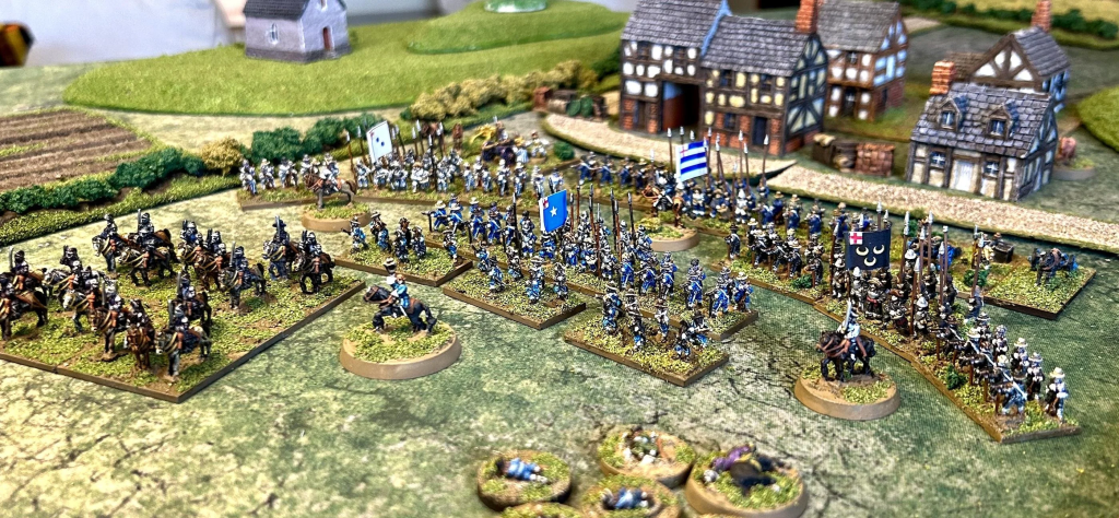 It would appear that PA figures are typically mounted on 20mm frontage bases, so four bases of 2×2 infantry or 2×1 cavalry would make up a unit, giving a frontage of equal to my 10mm scale standard basing – the difference being that the Pendraken unit would consist of 40 infantry instead of 16!