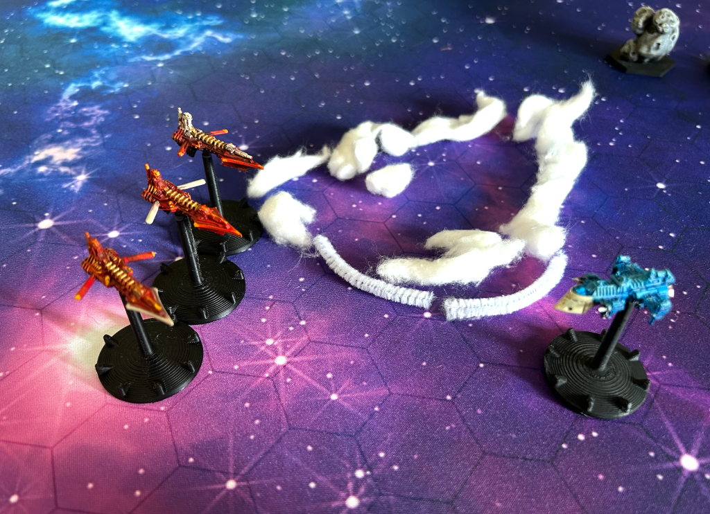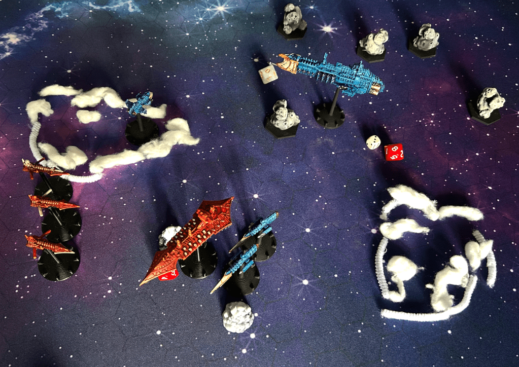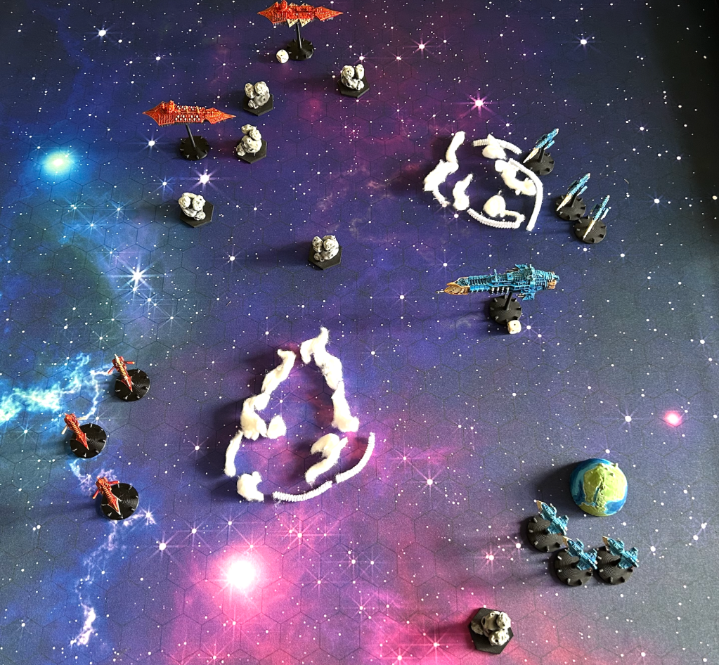 The hexes made movement and measuring pretty unequivocal and there were no drawbacks I could see particularly – it made the compulsory 2-hex movement before turning pretty hairy around the asteroid field.