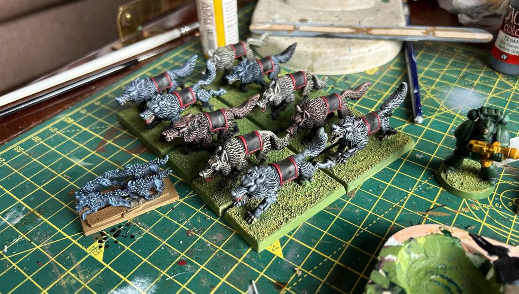 The old (28mm) and the new (10mm) Direwolves shows where I went with my rank and flank fantasy.